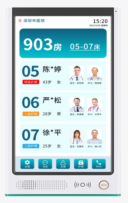 9、医护列表:展示本护理单元的医护信息,支持多模板设置,包括医护照片、床位信息、房间信息、患者信息等。